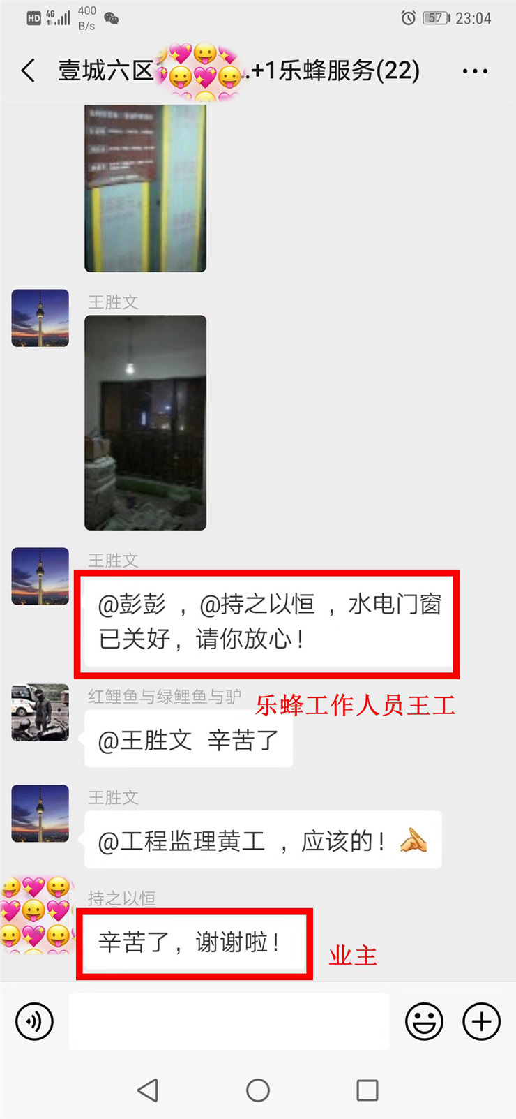 新家正在施工的業(yè)主們昨晚得有多擔(dān)心,作為外人,我們無(wú)法感同身受。樂(lè)蜂的一線工作人員們?yōu)榱俗寴I(yè)主少操點(diǎn)心,冒著昨晚的暴風(fēng)雨只身趕往工地,并在樂(lè)蜂的7+1微信服務(wù)群里實(shí)時(shí)匯報(bào)巡檢情況。
