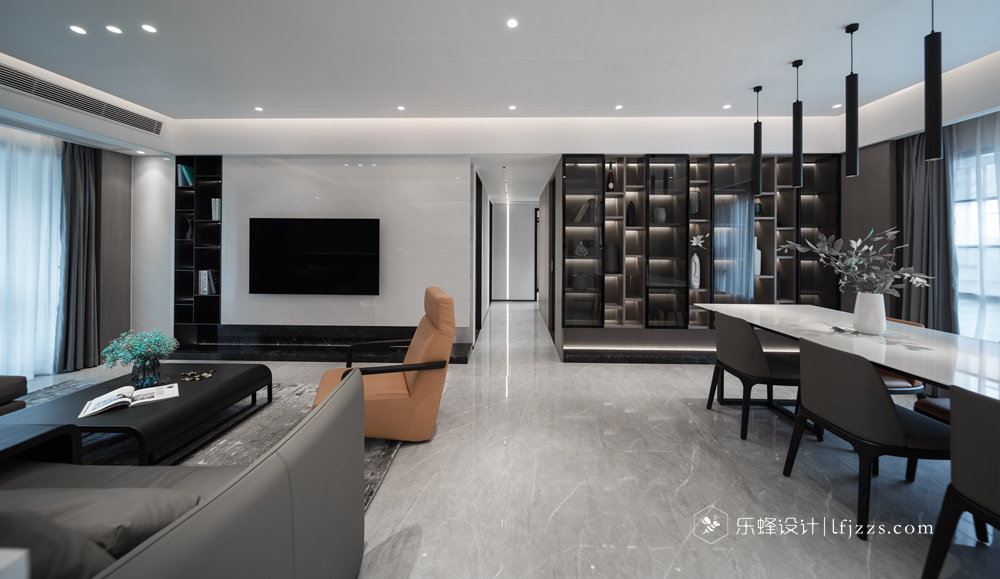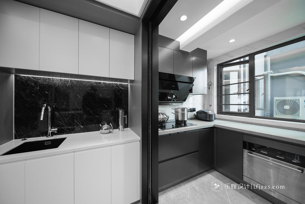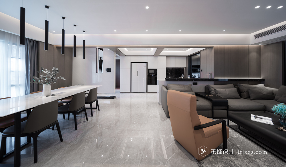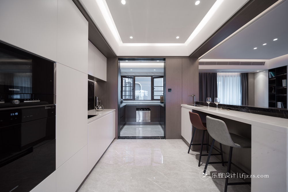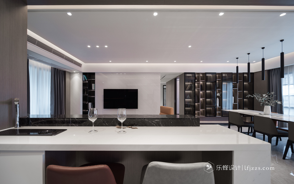 色彩簡約,空間以白色為主基調,摒棄傳統(tǒng)的吊燈,使用點光源的筒燈,使燈光更有層次感,整個空間的燈光也更柔和。再搭配墻磚的質感和高純度色彩,來引入一種時尚感。