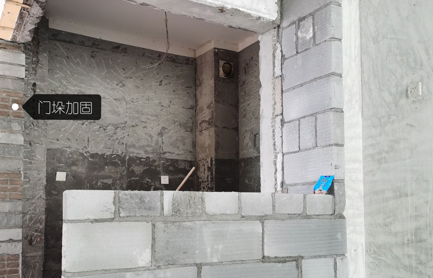3、門垛加固:在安裝合頁的地方我們用小沙磚加固,因為輕質(zhì)磚硬度不夠,防止后期關(guān)門動作比較大的時候,合頁松動。
