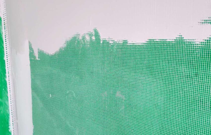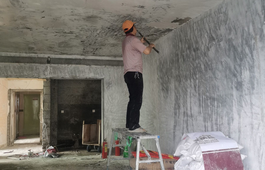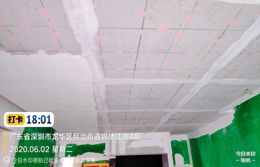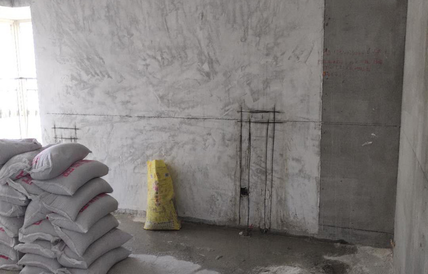墻面批灰,第一遍用外墻膩子,同時掛纖維網(wǎng)。施工工藝:①天花接縫處及水電開槽處做防開裂處理。②全房墻面掛纖維網(wǎng),防止膩子層開裂,埃特板造型釘眼處做防銹處理。③貼陰陽角條。