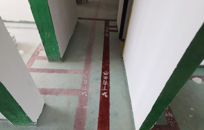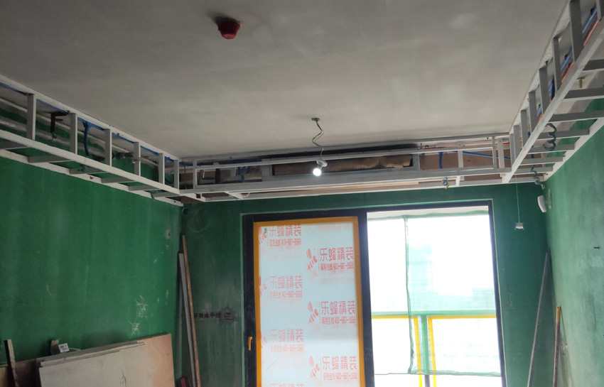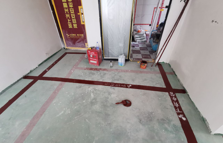 A:天花吊頂龍骨采用防火漆處理拋光木龍骨,每隔60cm用拉爆螺絲與原結(jié)構(gòu)樓板固定;B:水電封槽完畢刷完地寶后,在地面上布有水管線管位置用紅色油漆劃線,標(biāo)注“下有水管/線管”字樣,方便后期檢修。
