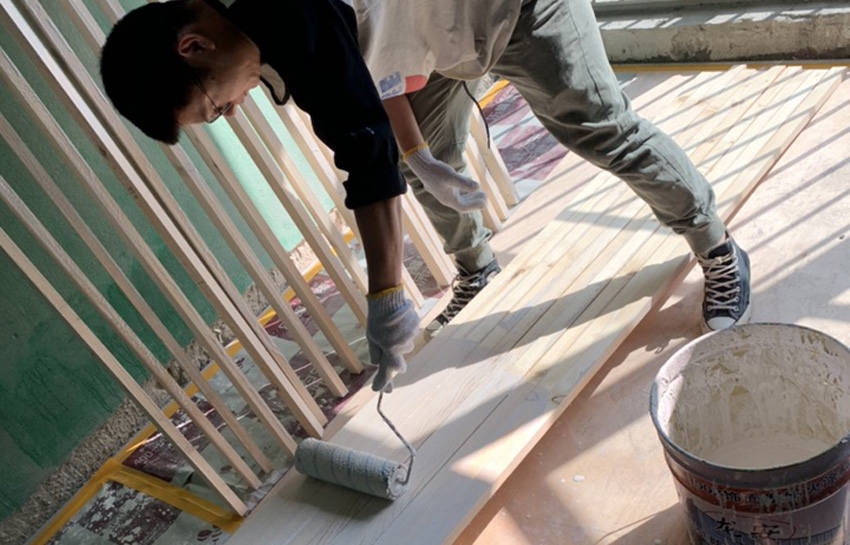 A:木工材料現(xiàn)場驗收,木龍骨,夾板,水泥板;現(xiàn)場刷防火涂料,還有防白蟻防治;B:貼磚過程中會用水平儀來確保磚的平整度。貼完磚后會對地磚進行一個保護,避免施工過程中損壞地磚;C:衛(wèi)生間刷好防水后做48小時閉水試驗