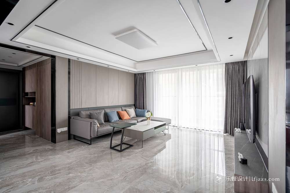 灰色花紋色的電視背景墻與硬包的搭配,從視覺拉長整體比例感?;疑嫫ど嘲l(fā)、大落地窗、白色紗簾的光感,融合成溫馨舒適的空間。