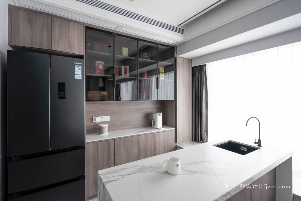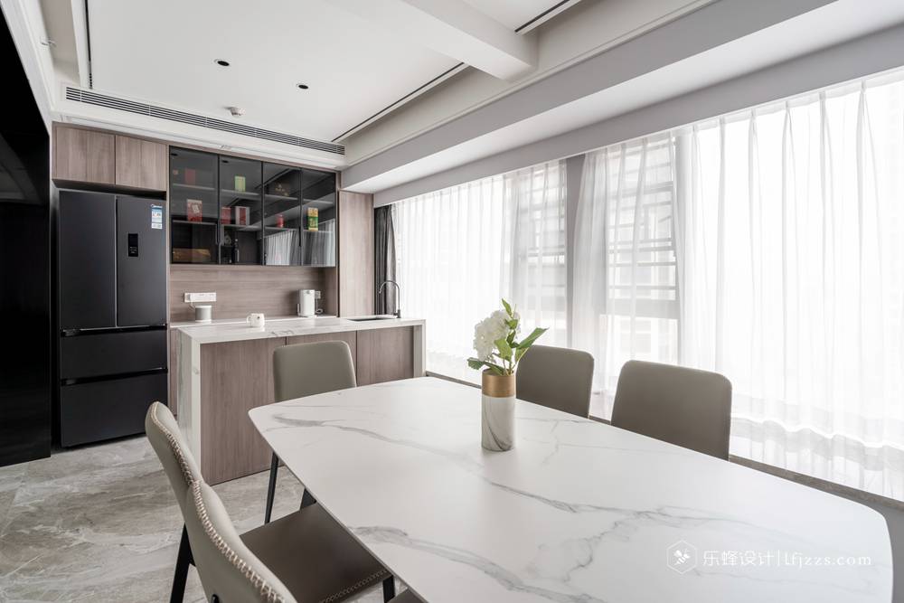 吧臺作為一個輕食臺和餐桌高低組合,組成一個方便別致的聚餐區(qū)。同時滿足少數(shù)人和多人的進(jìn)食需求。吧臺后面 做了一面柜體滿足了收納功能,還能把冰箱鑲嵌進(jìn)去,做到安全又美觀。