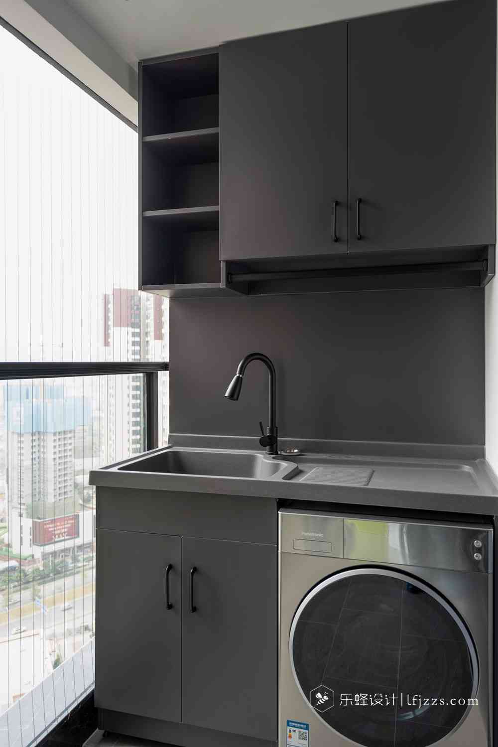 生活陽臺與客廳直接打通,把空間承托的更大的大氣,洗衣機(jī)鑲嵌在洗手臺下面,整體設(shè)計布置簡潔自然。