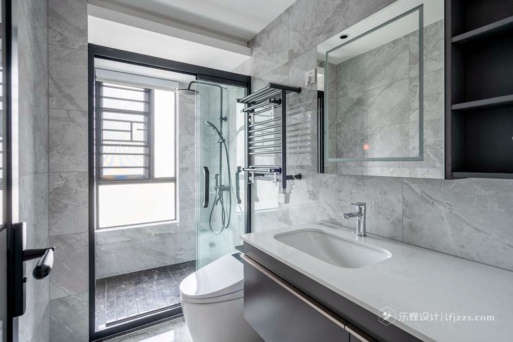 衛(wèi)生間,沐浴區(qū)用玻璃分割,做到干濕分離,用淺灰色大理石鋪面,簡約造型的潔具,整體雅白的衛(wèi)生間布置也顯得干凈而舒適,讓狹小的空間多了些許精致感。