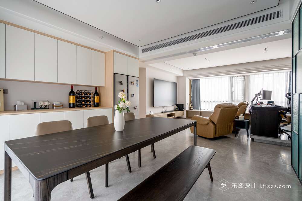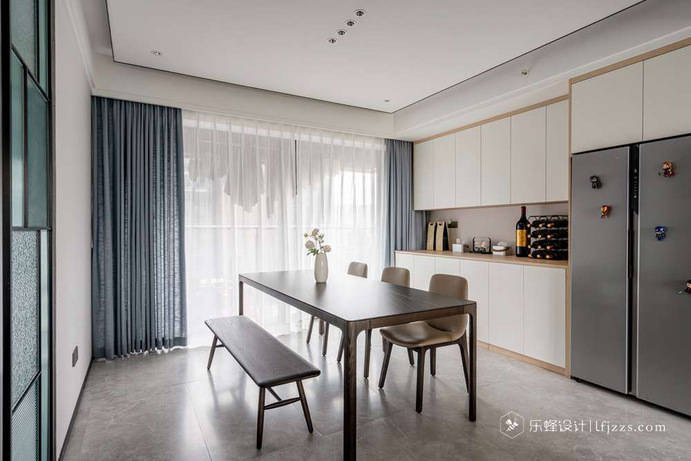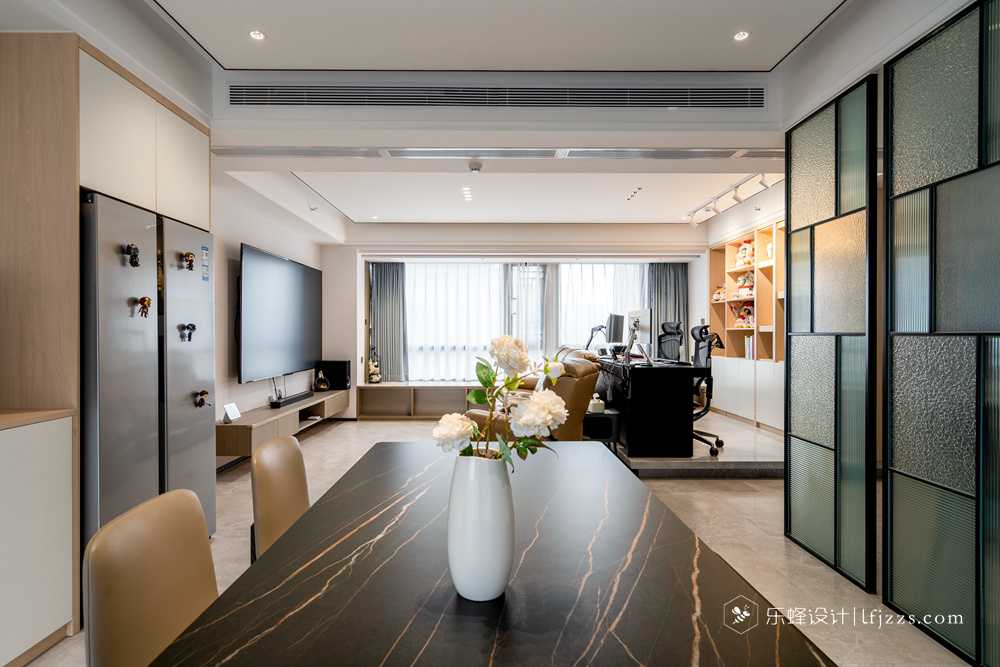 色彩簡約,空間以白色為主基調,摒棄傳統(tǒng)的吊燈,使用點光源的筒燈,使燈光更有層次感,整個空間的燈光也更柔和。再搭配墻磚的質感和高純度色彩,來引入一種時尚感。