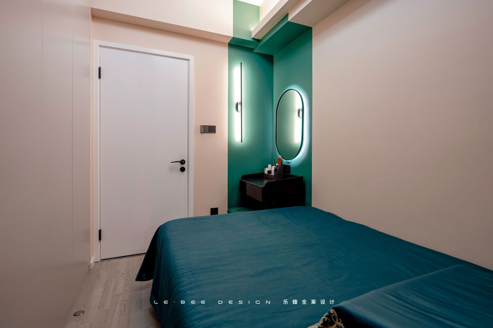 次臥室主要是長輩在這里休息,在門后的空間我們定制了整排的衣柜來增加換季的儲(chǔ)物空間,同時(shí)充分發(fā)揮次臥室的進(jìn)深放下床的同時(shí)留下過道方便進(jìn)出陽臺。
