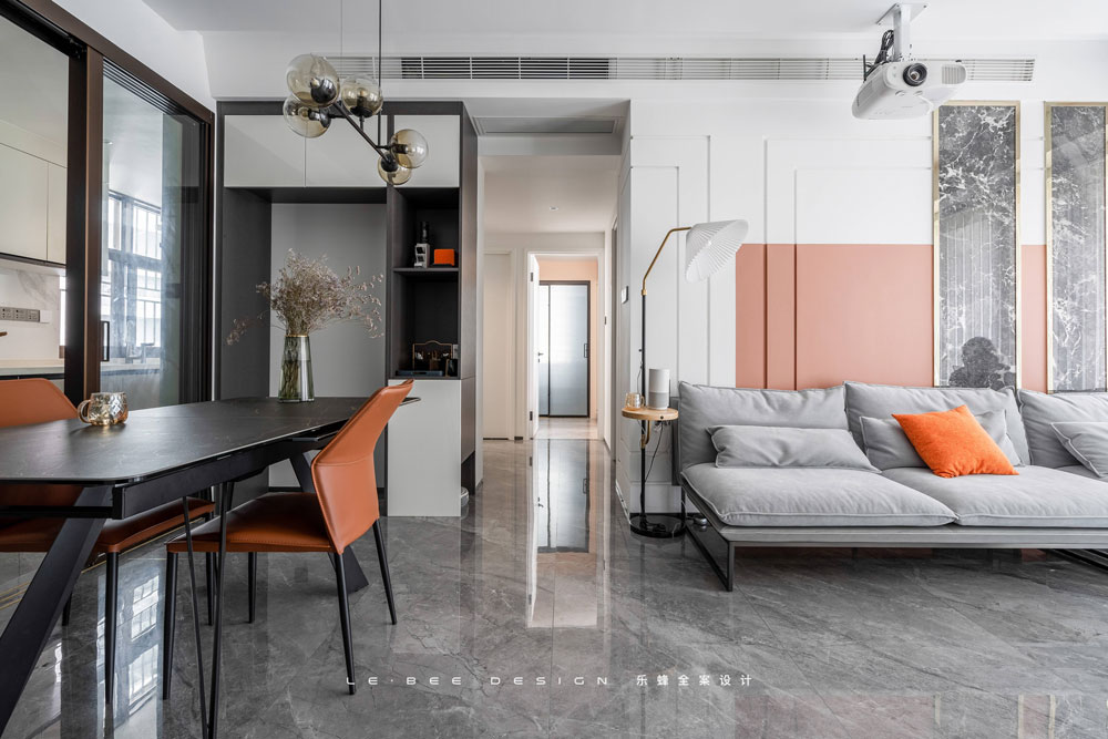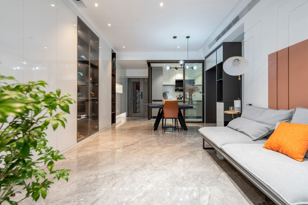 從入戶開始,鞋柜延伸到餐廳這邊的餐邊柜再到客廳作為儲(chǔ)物柜使用,充分整合了多種儲(chǔ)物空間,且看不到柜子側(cè)面也就沒有了空間的占用感,客餐廳這邊的柜門全部采用一門到頂?shù)脑O(shè)計(jì),視覺上拉高了整個(gè)空間的層高,即使是客餐廳和玄關(guān)做了無主燈的全覆蓋吊頂,也沒有絲毫的壓抑感。