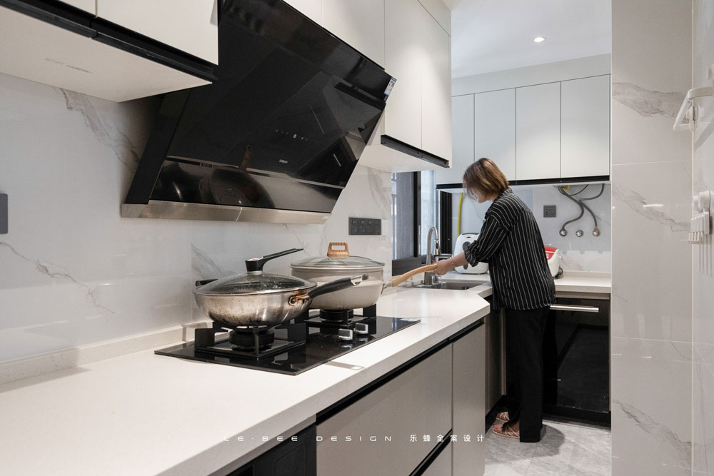 L型的櫥柜在布局的時(shí)候充分考慮到動(dòng)線的流暢,通過優(yōu)化櫥柜的寬度避開了煙道所在的突出位置,在使用方面更個(gè)性化的定制了多種廚房家電,大大減少了廚房烹飪和家務(wù)的勞動(dòng)量。