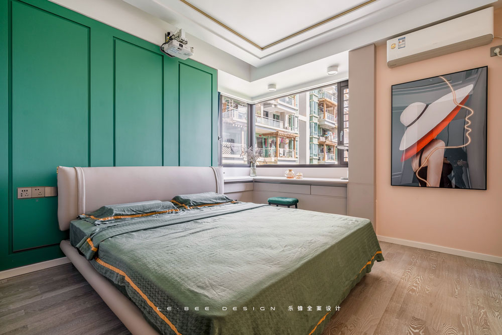 我們運(yùn)用了和主臥同樣的油漆色彩,不同的是我們在次臥室將梳妝臺作為背景的設(shè)計(jì),墨綠色和淺粉色在色彩上是明顯的對比色,在同一區(qū)域出現(xiàn)能夠突出色彩的反轉(zhuǎn),在吊頂和頂面的處理上,色彩和疊級增加了空間的層次感