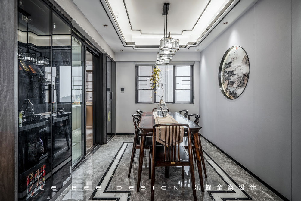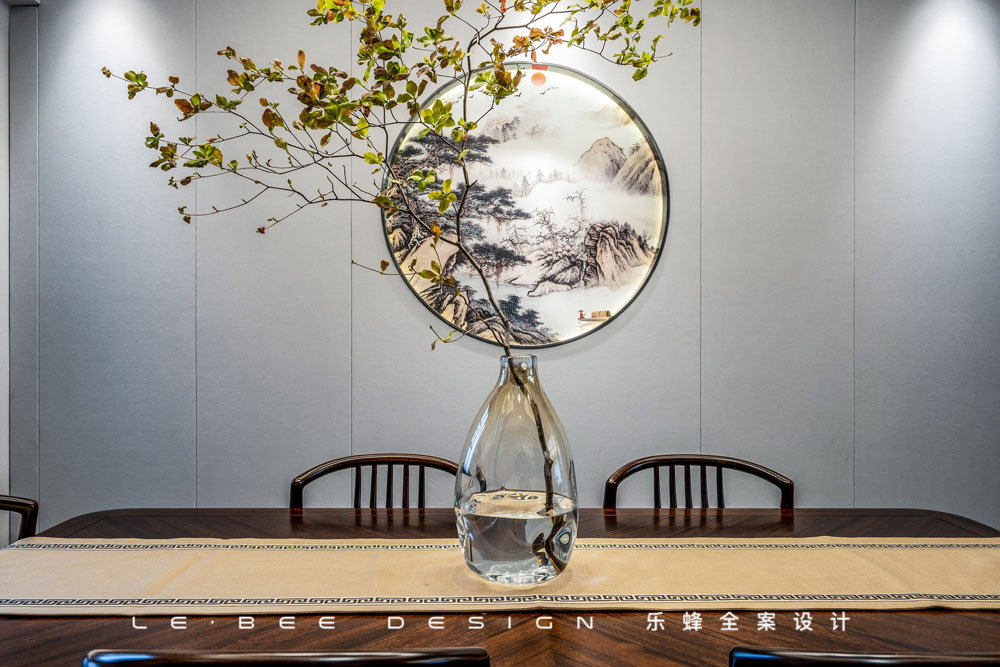 餐廳設(shè)計(jì)更偏簡(jiǎn)約,大面積灰色墻咔作為背景,中間圓形壁畫(huà),整個(gè)空間有方有圓,突出中式對(duì)于方圓的理念追求。