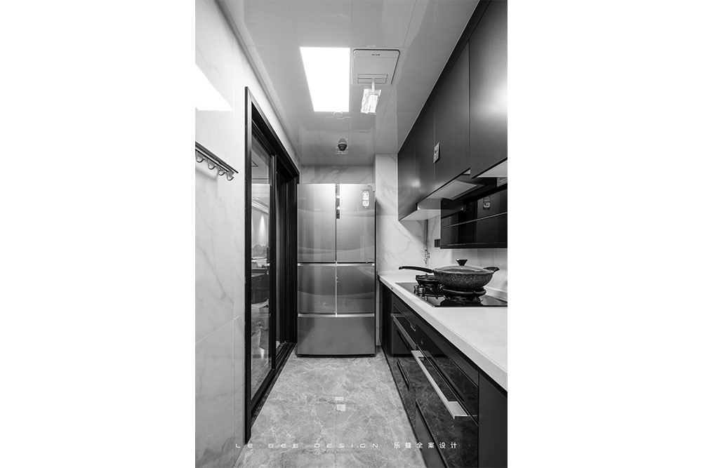 經(jīng)過(guò)重新規(guī)劃的廚房結(jié)構(gòu)特地給冰箱留了位置,剛好嵌入墻體,不占表面空間,取物十分方便。