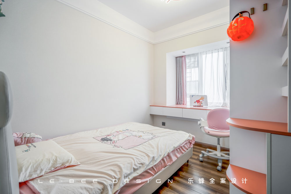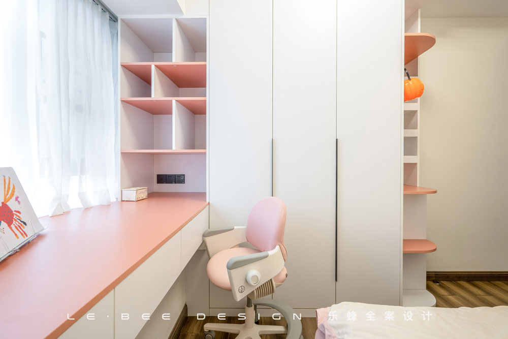 和男孩房想對(duì)應(yīng)的設(shè)計(jì)思路,顏色選取了女孩們都會(huì)喜歡蜜桃粉,營(yíng)造一個(gè)小公主的天地。