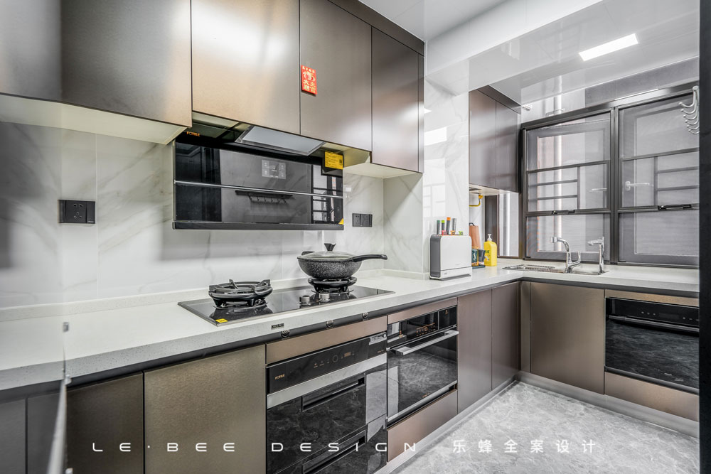 金棕亮面門(mén)板使廚房這種充滿現(xiàn)代格調(diào)的區(qū)域也不脫離整體中式復(fù)古氣息,納入小陽(yáng)臺(tái)后廚房空間頓時(shí)大了不少,櫥柜容量增加得到增加,讓許多電器都能輕松嵌入。