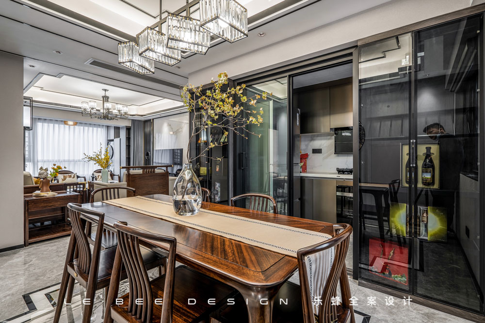 餐邊柜選用了玻璃柜門(mén),加強(qiáng)空間的通透感,玻璃柜門(mén)和廚房推拉門(mén)相互融合,搭配的妙處無(wú)處不在。