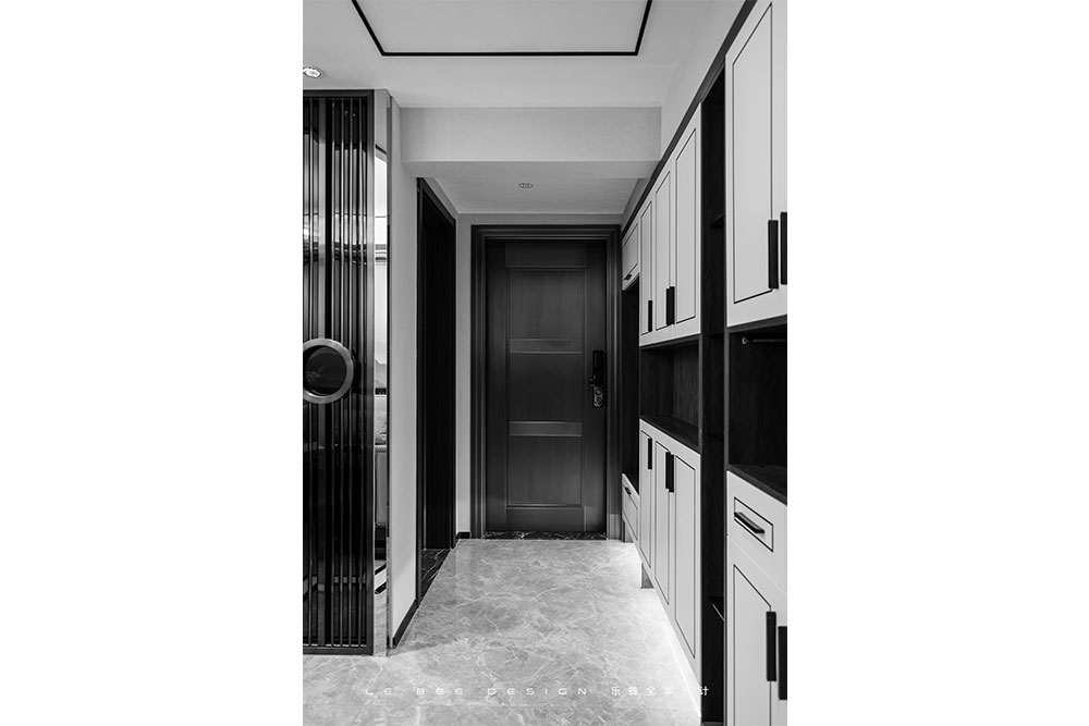 通過(guò)擴(kuò)展后,得到的是一個(gè)單獨(dú)舒展的玄關(guān)空間。黑白搭配是永遠(yuǎn)不變的經(jīng)典,白底的鞋柜門(mén)板加上黑色線條,棋盤(pán)般的工整有序讓人印象深刻。