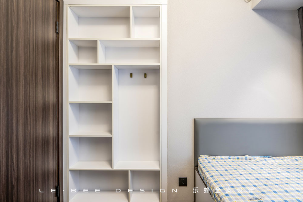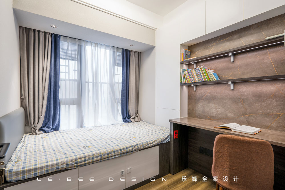 在滿足所有功能需求的前提下,保留了充足的活動(dòng)空間,床做了榻榻米設(shè)計(jì),床下方是抽屜式收納,墻面簡(jiǎn)潔直接的線條式書(shū)架搭配書(shū)桌,學(xué)習(xí)辦公的最佳場(chǎng)所。