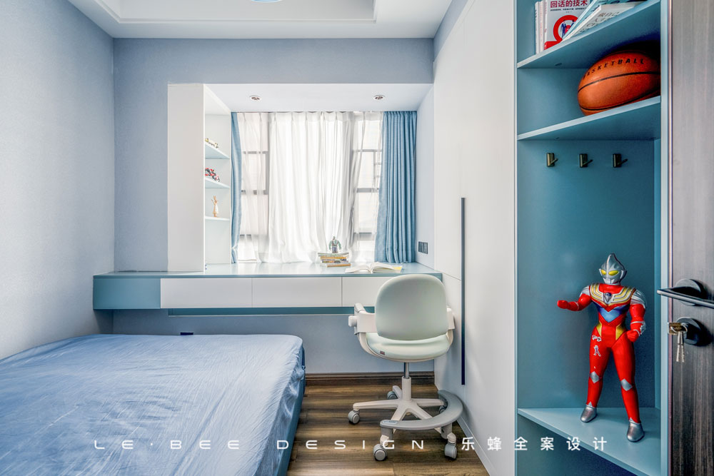 男孩房的設(shè)計(jì)以藍(lán)色為主色調(diào),清新活潑,和白色相搭,仿佛墜入藍(lán)天白云的世界。