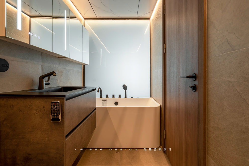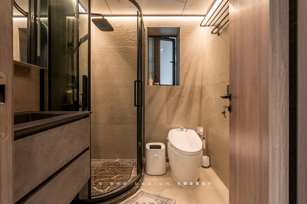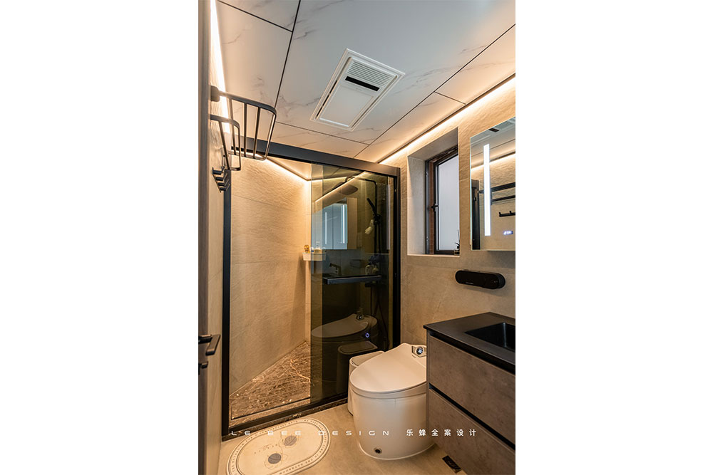 干濕分離的設計減少了衛(wèi)生間清潔壓力,四周一圈燈帶既能做主要照明,又能作為輔助照明加強室內氛圍。 小三角區(qū)域難以利用,我們設計成淋浴區(qū)就合理許多,空間足夠,自身的獨特格局也成為了設計感的體現,將缺點轉化優(yōu)點是設計的奇妙之處。