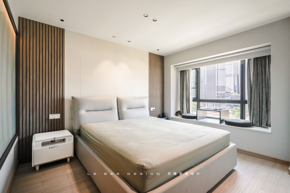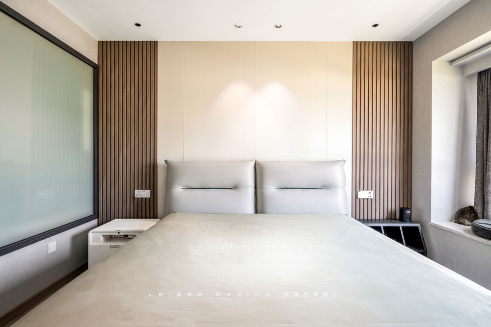 主題風格保持統(tǒng)一,米色墻咔和木飾面組合,以精準比例進行分割。 飄窗擺上小桌臺和桌墊,室內休閑區(qū)完美解決。 無主燈設計部降低室內層高,整個空間舒展無比。