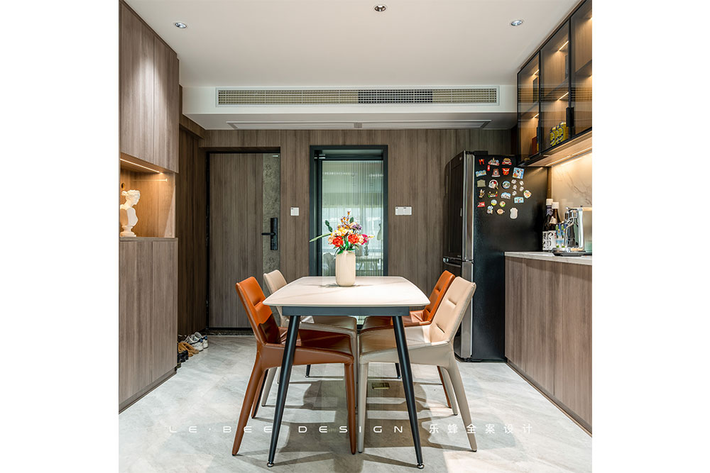 被三面包裹的餐廳擁有原木不斷傳遞的溫馨體感,獨立餐桌放置中央,保證了餐桌四周的動線通暢。 頂面加長出風口延伸頂部空間。除了吊頂的燈源,四周柜體散發(fā)的暖光增加了餐廳的燈光層次,家人的每日就餐更具儀式感。