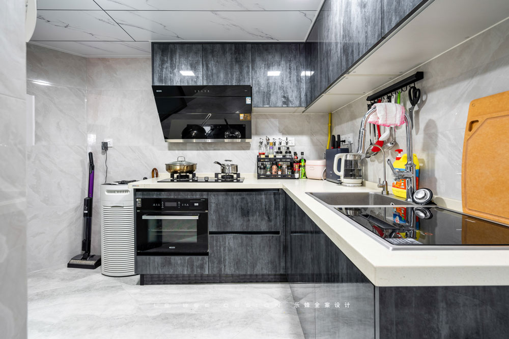 7字型的櫥柜布局對廚房空間進行最大化利用,洗、切、炒功能動線流暢,灶臺靠近廚房門,出餐便捷。 內嵌水槽式洗碗機,做家務也能變成一種享受。