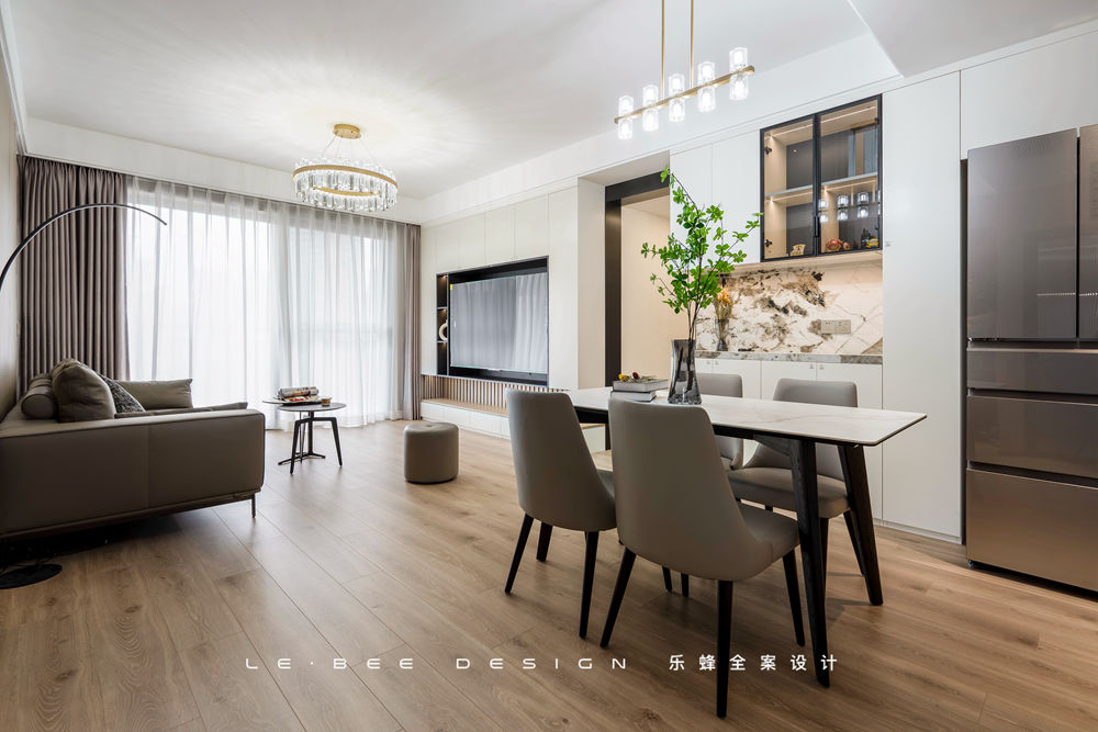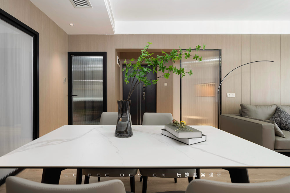 簡(jiǎn)單填充功能便丟失了家的藝術(shù),餐廳向來和客廳是相輔相成的存在。在格局上,一面餐邊柜加餐桌,整個(gè)餐廳顯得豐富又自在。足夠的空間設(shè)計(jì)回字型動(dòng)線,更適合活潑的孩子們四處走動(dòng)。