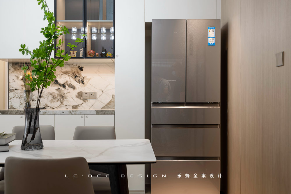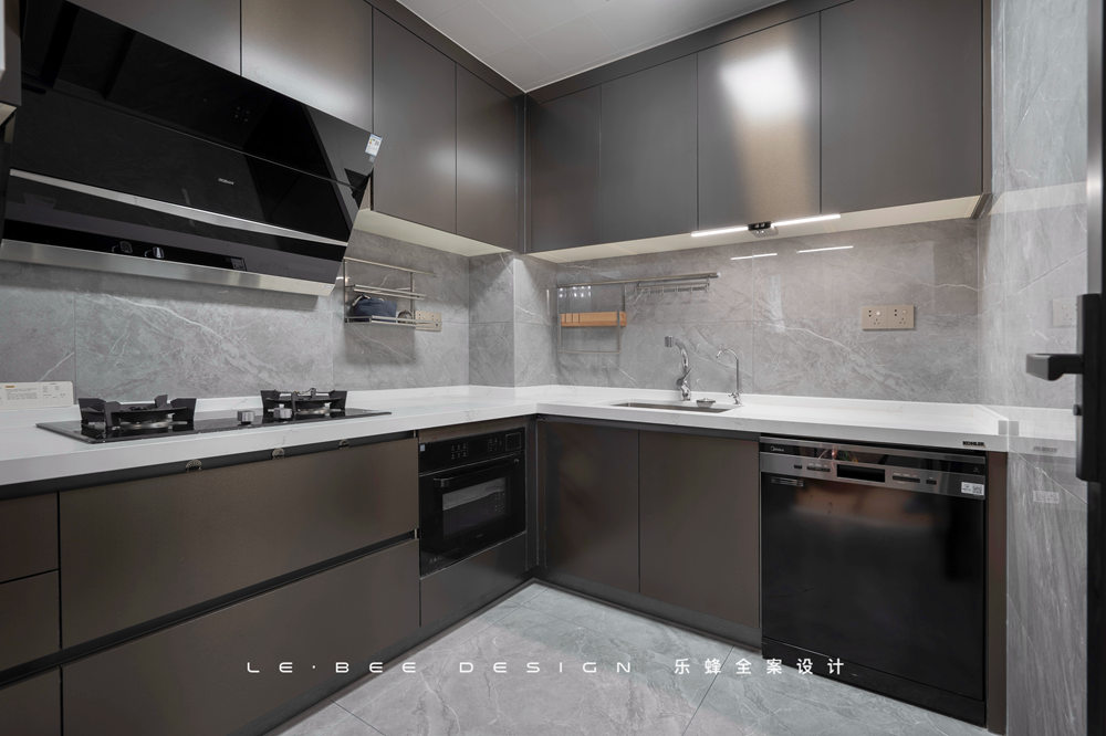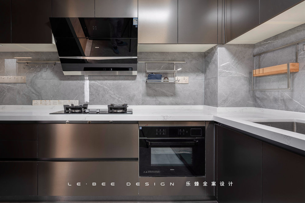 L字型空間布局,擴(kuò)大廚房利用面積后,廚房操作能滿足多人同時(shí)使用。超晶板是櫥柜最高級(jí)的材質(zhì)之一,對(duì)于廚房的光線能夠進(jìn)行溫和地反射,材質(zhì)紋理細(xì)膩到無可挑剔。