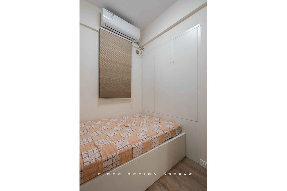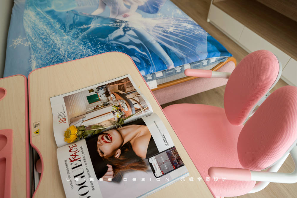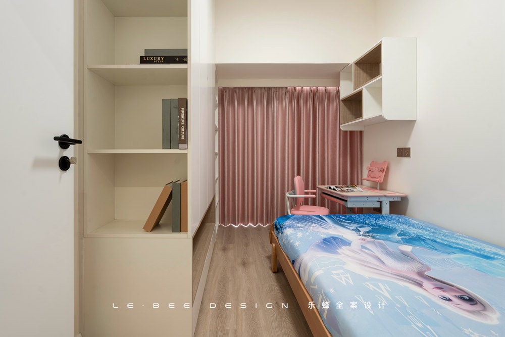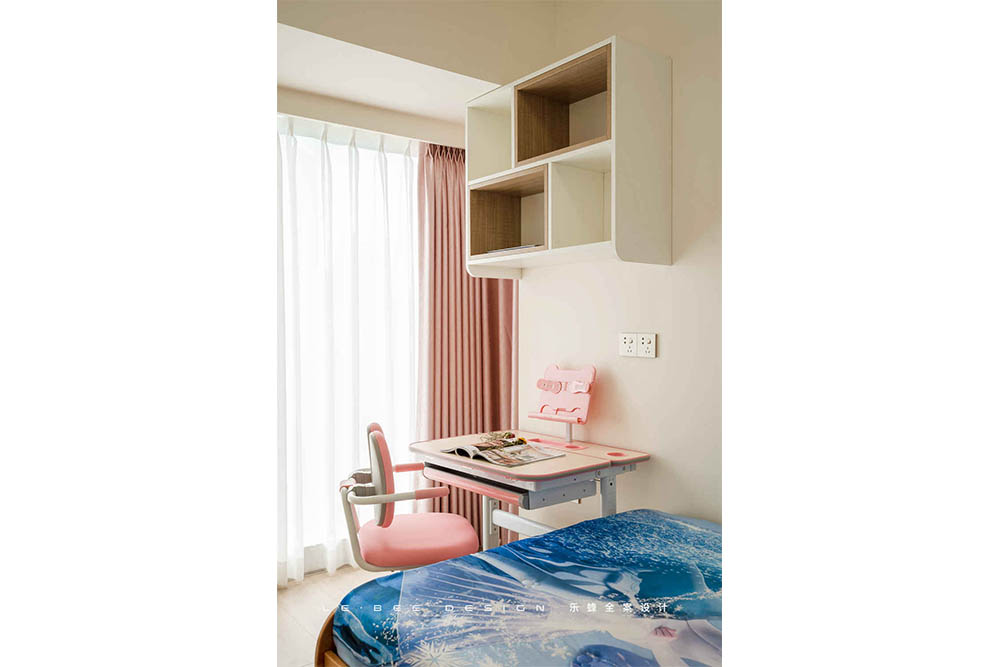 小女孩的房間除了要滿足女孩的美好幻想,足夠的收納空間也必須滿足。床體靠墻擺放,另一面設(shè)計(jì)整面墻的柜體,女孩的衣物、玩具、公仔,全部都不在話下。