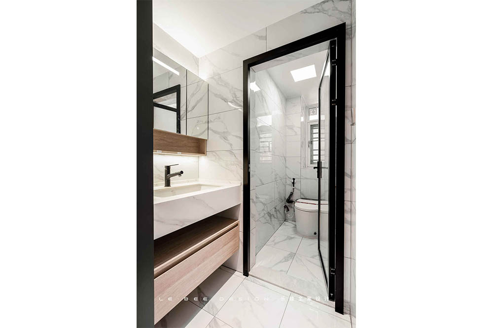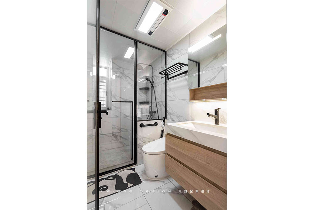 原始衛(wèi)生間格局沒有經(jīng)過改動(dòng),干濕分離,為了減少空間的壓抑感,淋浴隔斷只采取了半墻為實(shí)體墻,其余全部為玻璃隔斷,空間的通透感達(dá)到最佳。