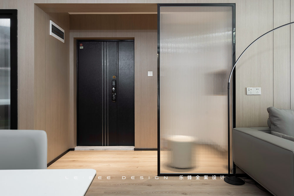 顏色選擇了業(yè)主一家最愛的淺色系,淺色木質(zhì)紋理有金色絲綢質(zhì)感,當(dāng)然功不可沒的是玄關(guān)處的暖色燈光烘托。在吊柜和地軌的兩處燈帶照耀下,玄關(guān)變得暖盈盈的,借此也為整個(gè)家的基調(diào)做了鋪墊。
