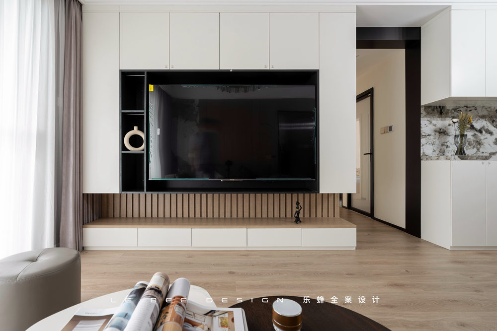 地面選擇暖色地板通鋪,在陽光照耀下反射瑩瑩微光。沙發(fā)背景選擇木飾面板,沒有刻意去掉拼接痕跡,增加了平面的線條和紋路,細(xì)小的紋路也能有跌宕的起伏。除此之外,沙發(fā)背景添加了一塊巖板進(jìn)行拼接,風(fēng)格迥異的材質(zhì)之間也能產(chǎn)生和諧之美。
