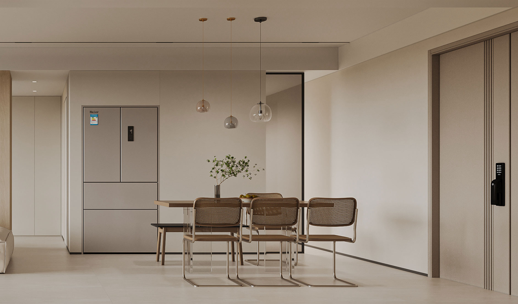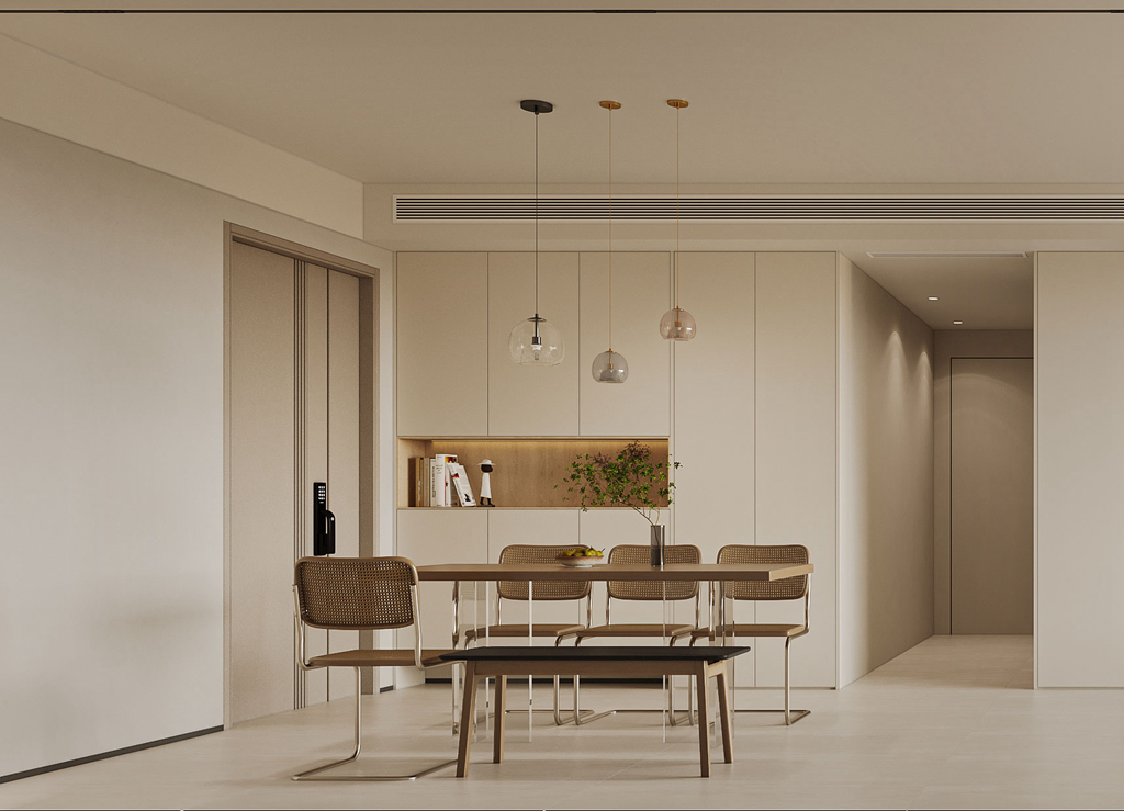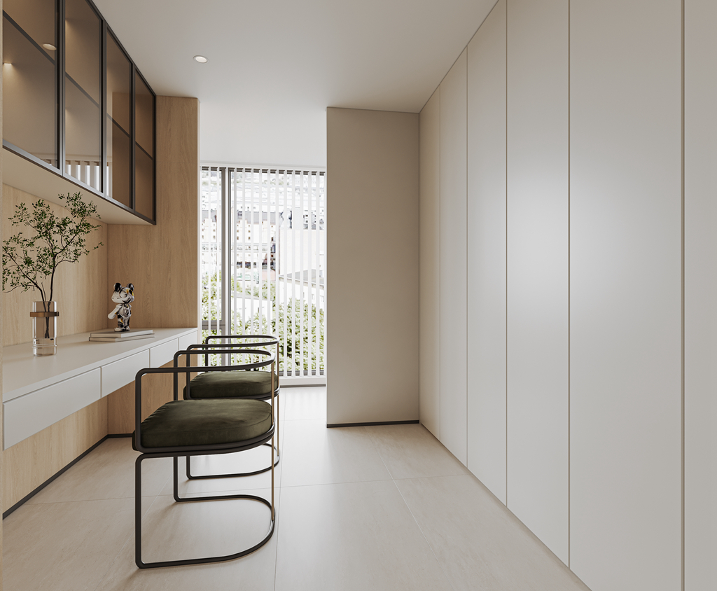 在現(xiàn)代簡約風(fēng)的設(shè)計(jì)上,美學(xué)原則是關(guān)鍵。室內(nèi)色調(diào)通常選擇白色、灰色等素雅色系作為基調(diào),以增加空間明亮感和視覺延伸感,同時(shí)也提供了更多的創(chuàng)造性發(fā)揮空間。本案這對夫妻業(yè)主對簡約的裝修風(fēng)格情有獨(dú)鐘,他們希望家中的每個(gè)角落都洋溢著溫馨與簡約的氛圍。為了滿足他們對收納空間的需求,同時(shí)避免臥室中,床與主衛(wèi)相對的尷尬布局,設(shè)計(jì)師決定以現(xiàn)代簡約風(fēng)為主題,充分利用空間布局和細(xì)節(jié)設(shè)計(jì)來實(shí)現(xiàn)業(yè)主的期望。