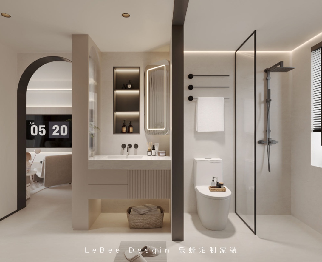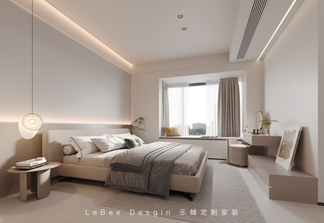 本案業(yè)主是一位很有想法的溫暖男青年,所以樂(lè)蜂裝飾的方碩老師在設(shè)計(jì)上使用最簡(jiǎn)潔的表達(dá),結(jié)合現(xiàn)代主義,選擇柔和的奶油色調(diào)色板和天然生態(tài)材料,營(yíng)造甜而不膩的舒適和溫暖~