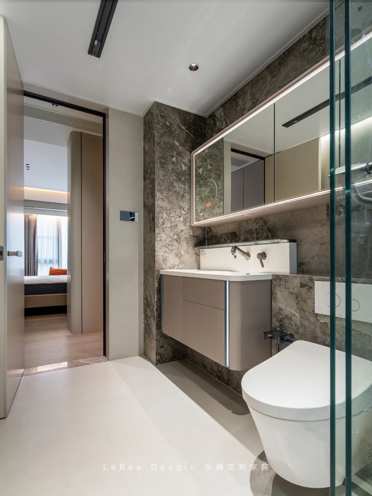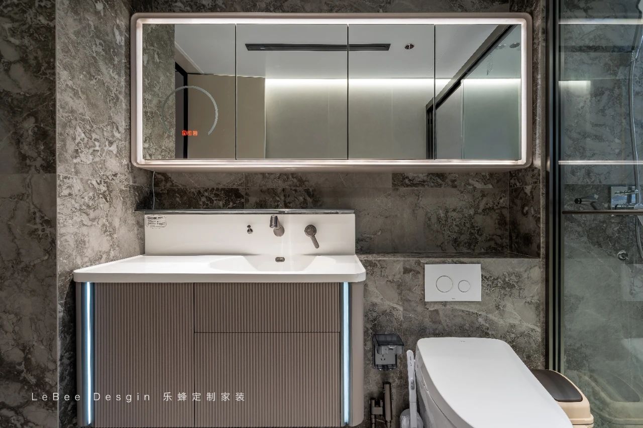衛(wèi)生間則采用了干濕分離的設(shè)計(jì)。干區(qū)與濕區(qū)通過玻璃隔斷清晰劃分,有效保持了空間的干燥與整潔。