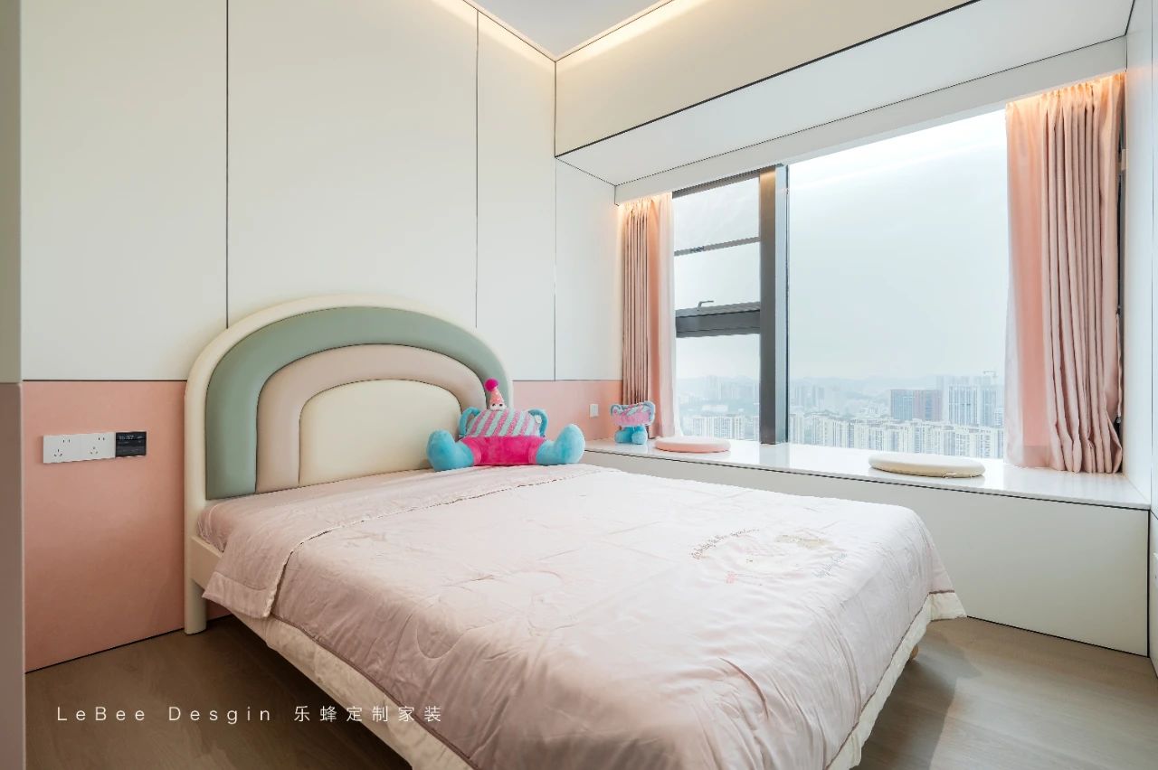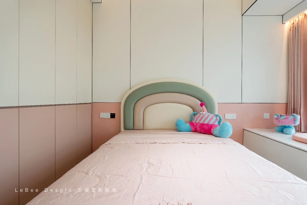 兒童房則延續(xù)了女孩房的設(shè)計(jì),沒有過多的設(shè)計(jì),有意思的是,床品背景做了造型設(shè)計(jì),讓整個(gè)空間顯得更加可愛溫馨。