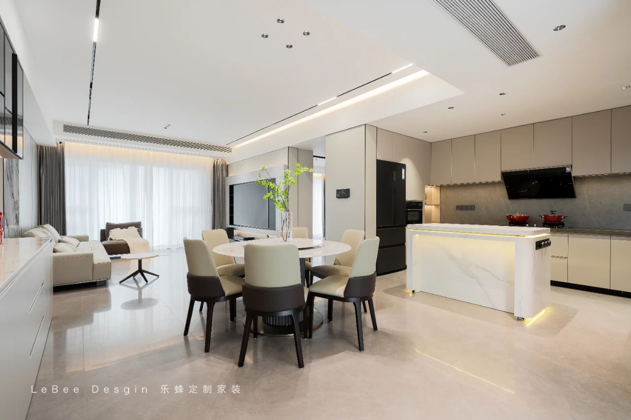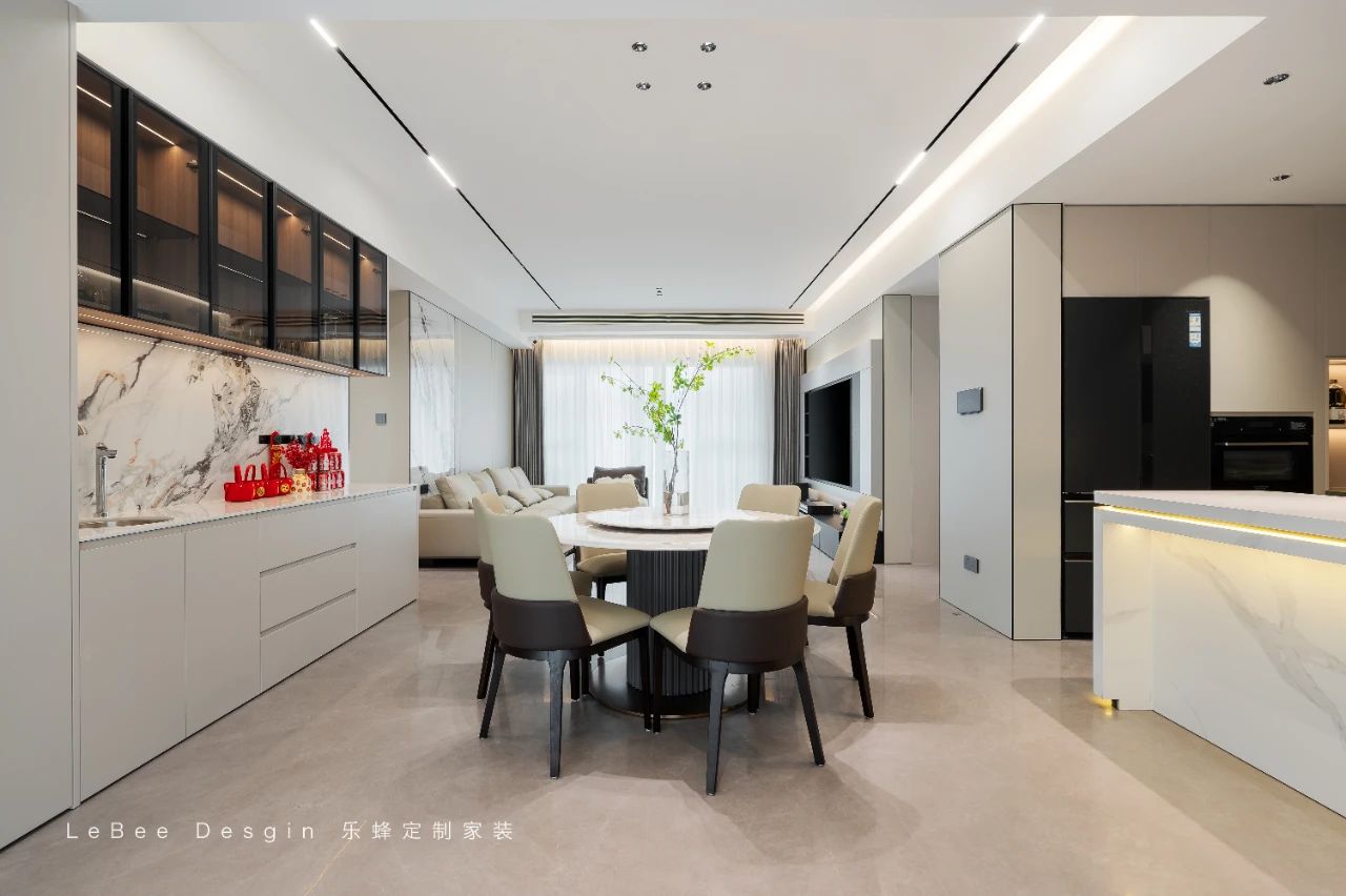 客廳一張巖板餐桌搭配著幾把簡(jiǎn)約的椅子,線條流暢,造型簡(jiǎn)潔。一家人圍坐在這里用餐,享受著溫馨的時(shí)光。上方的吊燈散發(fā)著柔和的光線,為用餐增添了一份浪漫的氛圍。