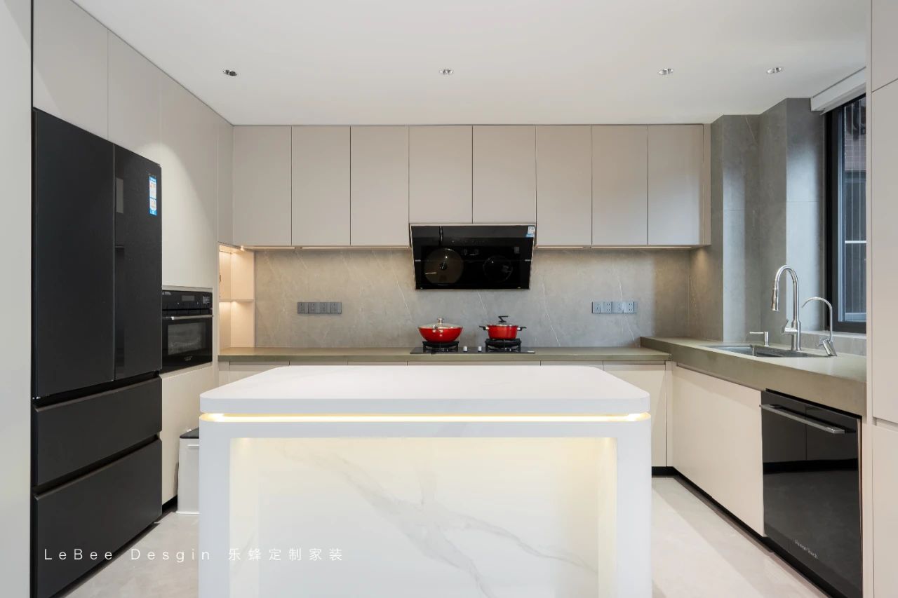 開放式的餐廚設(shè)計(jì),讓烹飪不再是一個(gè)人的孤獨(dú)勞作,而是與家人互動(dòng)交流的溫馨時(shí)刻。廚房中,白色的櫥柜搭配黑色的拉手,簡(jiǎn)潔又實(shí)用。