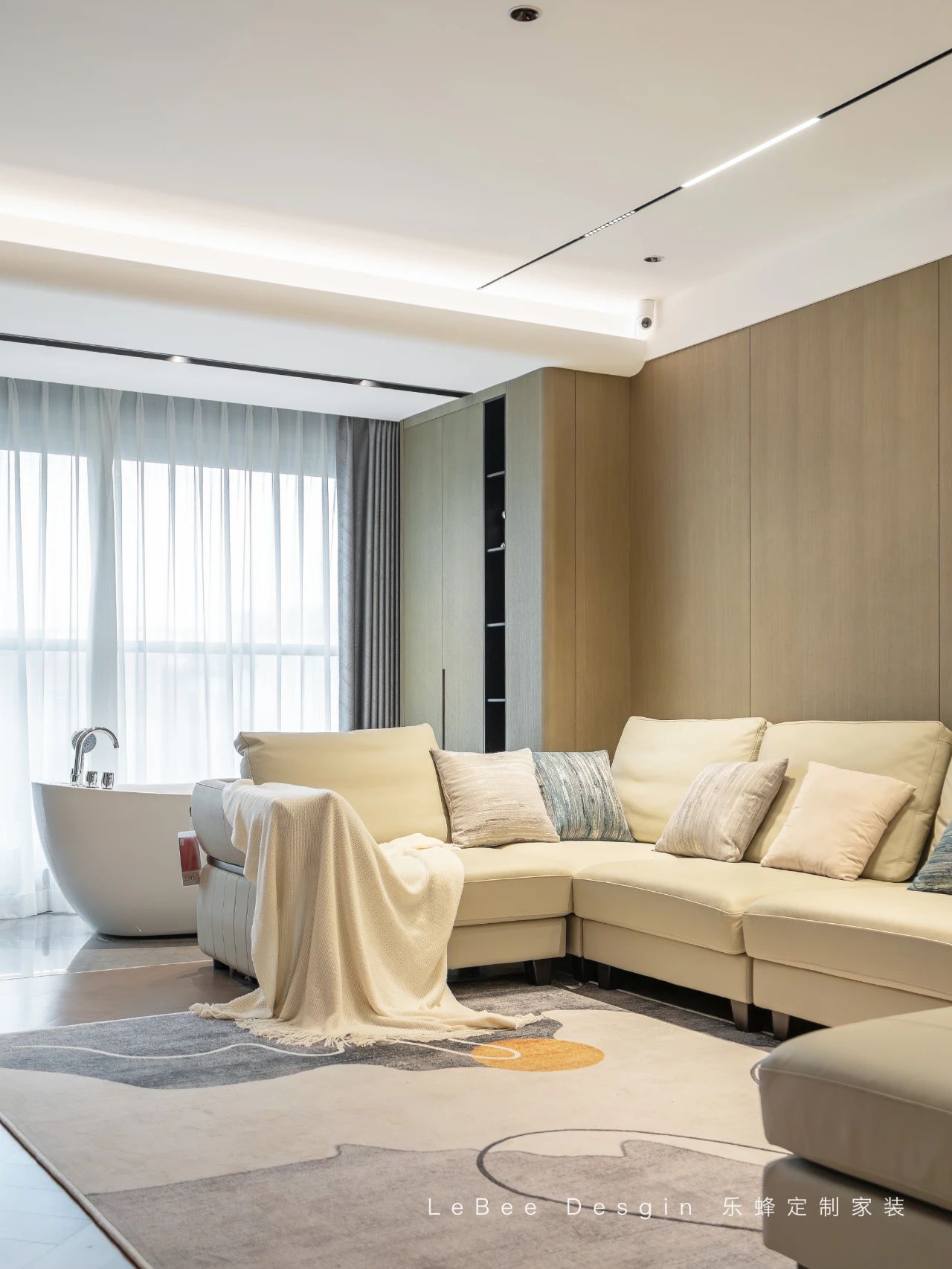 主臥延續(xù)客廳的風格,以淺咖色為主基調(diào),床頭不做復(fù)雜造型,做半墻背景,內(nèi)嵌燈帶,增加層次感的同時,也增加了照明,氛圍感超好。
