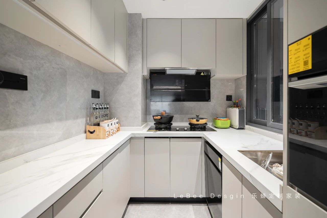 廚房體色系跟客廳搭配暖咖色,用亮光磚通鋪,裝好上下柜后幾乎沒有縫,清爽好打理,白石英石,拒絕擋水條,做無下掛,滴水好打理,柜子一做到頂,隱形拉手設(shè)計造型簡約大氣。
