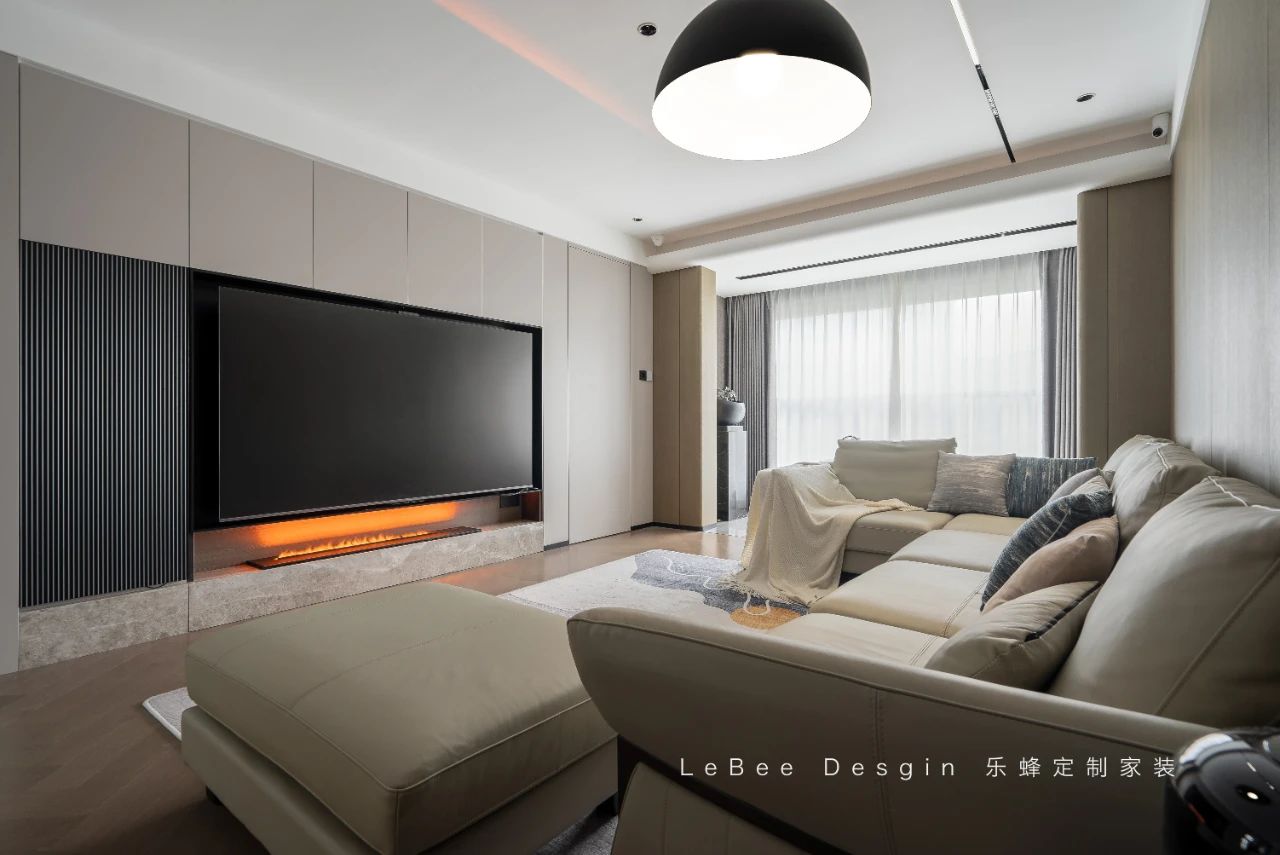 客廳選擇簡約大氣的電視背景墻,電視背景墻由木格柵、巖板巧妙組合而成,巖板的地臺加上??壁爐十分靈動。
