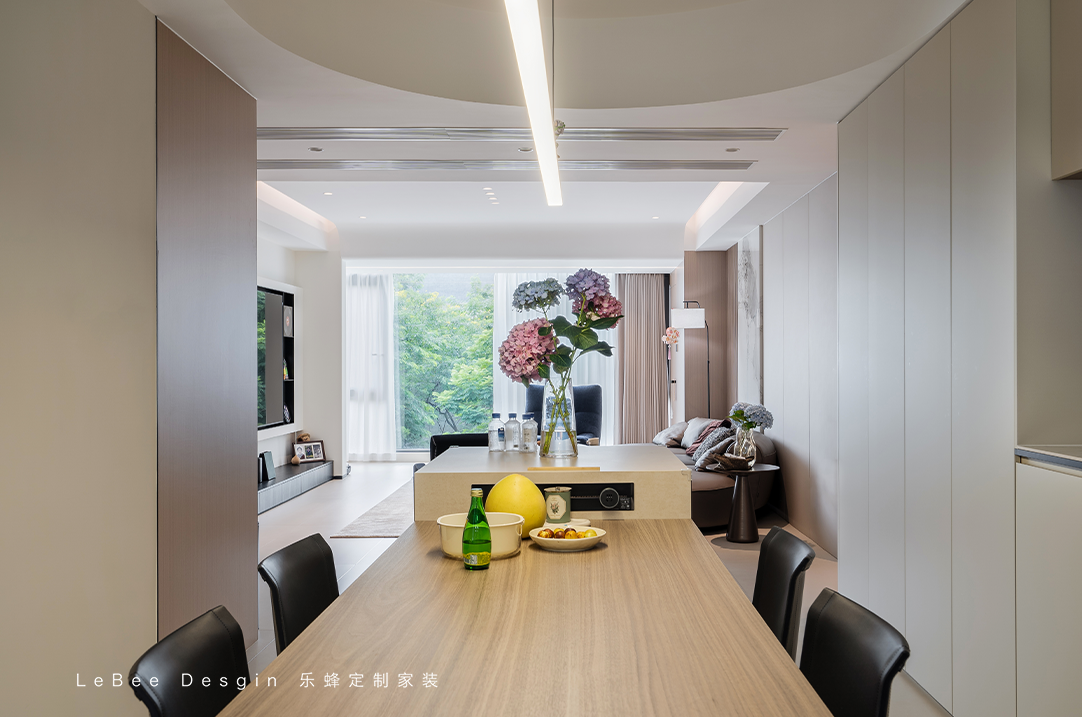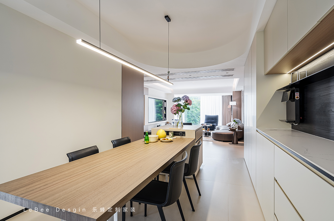 考慮到偶爾有家庭或朋友聚餐,餐廳選擇了長桌。原木餐桌+黑色餐椅點(diǎn)綴,讓整體溫馨又大氣。