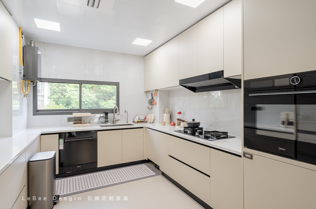 廚房U型設(shè)計(jì),洗菜切菜炒菜都很方便,動(dòng)線合理。選擇上下柜同色系,看起來整體效果更好,內(nèi)嵌入冰箱、蒸烤箱一體機(jī),嚴(yán)絲合縫,更省空間。