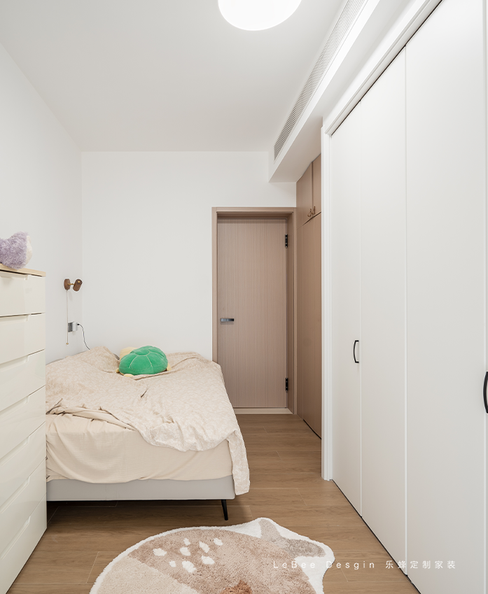 利用床尾打造一整排的淺白色衣柜,滿足日常收納需求的同時(shí),也讓整體色調(diào)更加協(xié)調(diào)統(tǒng)一~