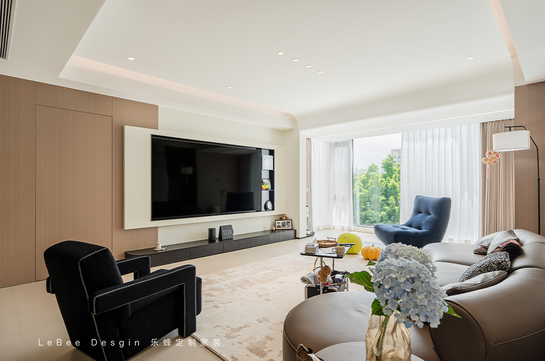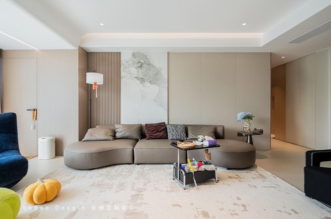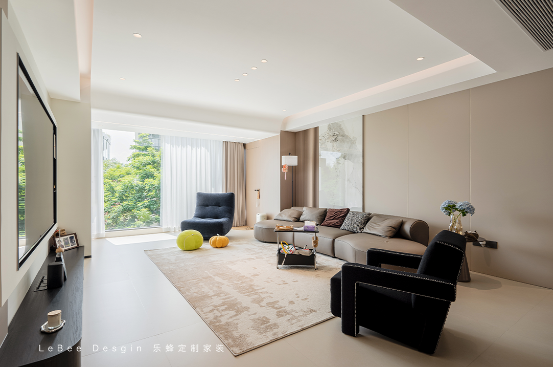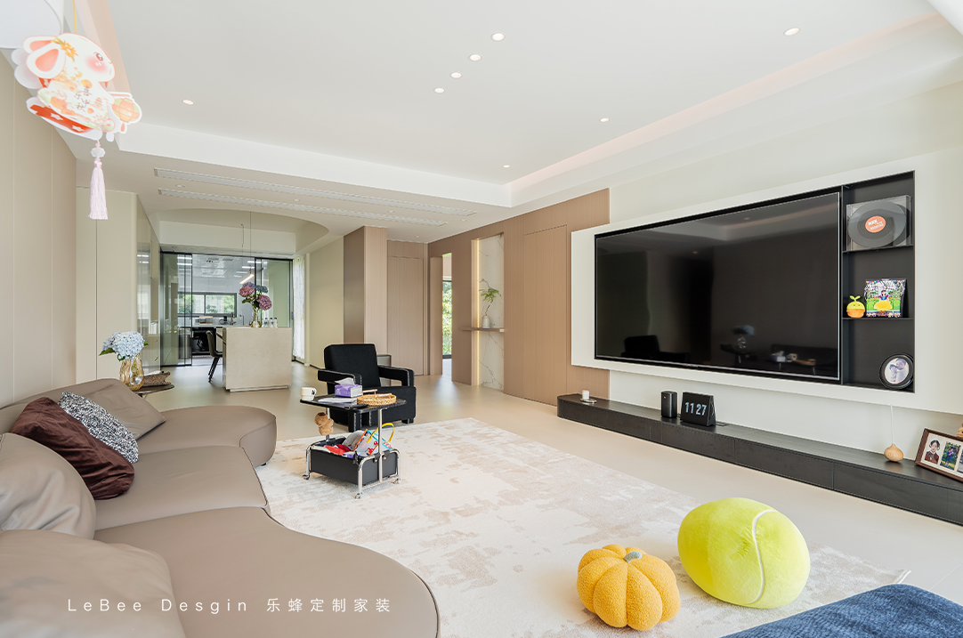 整體是一個(gè)大橫廳,淺色系搭配,墻面也不做如何復(fù)雜設(shè)計(jì),局部的黑咖色點(diǎn)綴便凸顯出了整體的層次感,看上去溫馨高級(jí)感十足。
