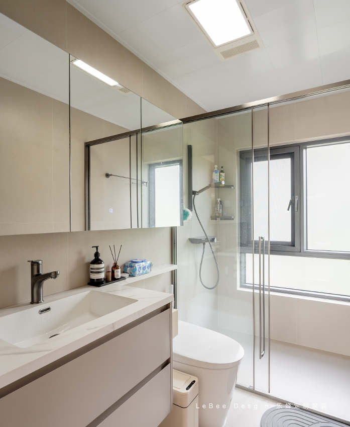 衛(wèi)生間遵循業(yè)主的需求做了干濕分離,延續(xù)客廳的風(fēng)格,大面積的白色瓷磚讓空間顯得更加寬敞明亮。