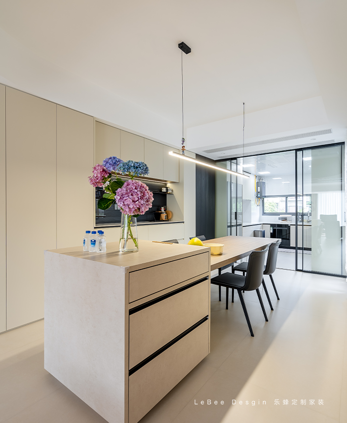 大量自然光線從廚房的窗戶進(jìn)入,給人明亮舒適的感覺餐廳和廚房用玻璃門隔,既隔絕油煙但廚房內(nèi)外的人還是可以進(jìn)行互動(dòng),廚房不再是一座孤島。