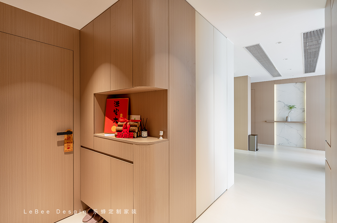 玄關(guān)轉(zhuǎn)角做圓弧處理,整體原木色+奶白色拼接,超有氛圍感,中間留空設(shè)計(jì),可作為展示柜,放置一些裝飾品。