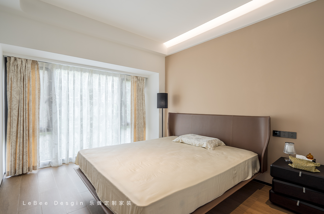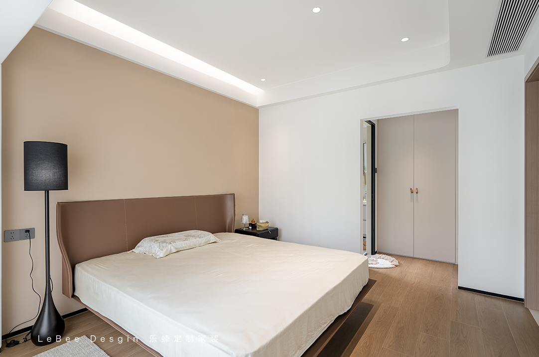 主臥室延續(xù)了整體的簡約風(fēng)格,以淺色色主,加上深咖色點(diǎn)綴,木地板營造出臥室的溫暖感,讓人感覺非常舒適。